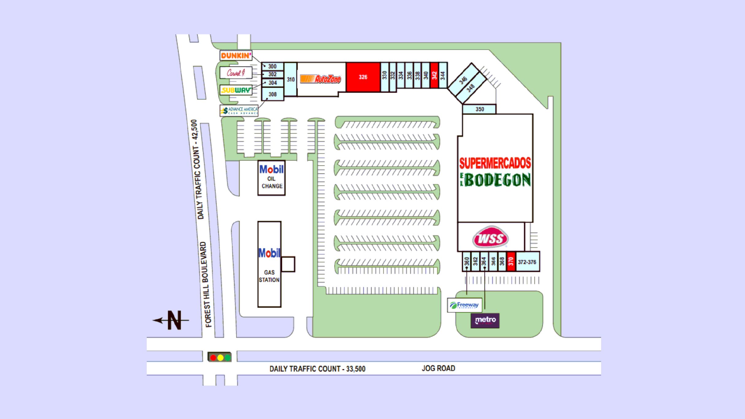 - Located at the signalized intersection of Forest Hill Blvd. and Jog Rd; one of the highest traffic intersections in all of Palm Beach County with 80,000 cars per day.