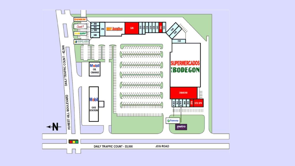 - Located at the signalized intersection of Forest Hill Blvd. and Jog Rd; one of the highest traffic intersections in all of Palm Beach County with 80,000 cars per day.